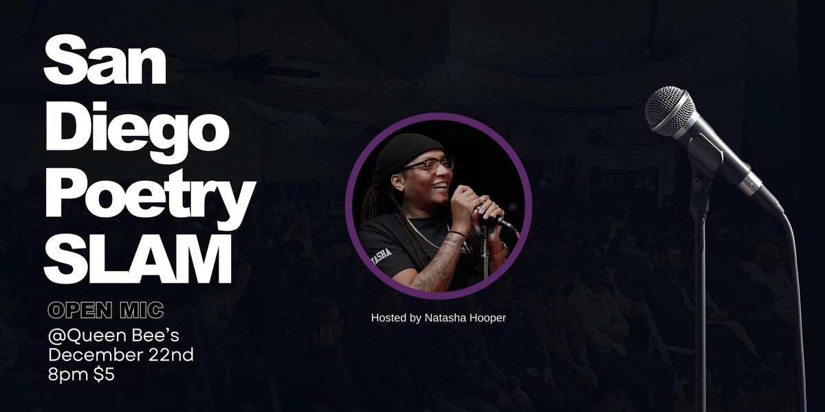 Welcome to the San Diego PoetrySLAM Open Mic at Queen Bee's Art and Cultural Center! Join us on December 22, 2025 at 8:00 PM (Pacific Time) for a night filled with creativity and expression. Bring your poems or just come to listen and enjoy the vibes. Let's celebrate the power of words together in the heart of San Diego. Don't miss out!