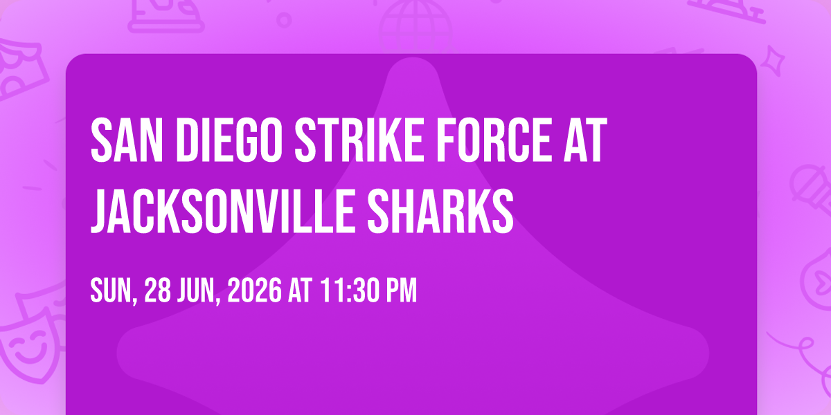 📍 Location: 30.3259, -81.645🌟 Be part of history at San Diego Strike Force at Jacksonville Sharks, an extraordinary gathering that will captivate your imagination! 🏛️ The prestigious VyStar Veterans Memorial Arena in Jacksonville, FL sets the stage for an unforgettable experience on June 28th, 2026 at 11:30 PM. ✨ They are bringing together the finest elements of entertainment and innovation to create moments that will take your breath away. From the moment you arrive, you'll be immersed in an atmosphere of wonder and excitement. 🎯 This carefully planned event ensures every guest experiences something truly special. 🎊 Early booking is recommended for this must-attend event of the season!