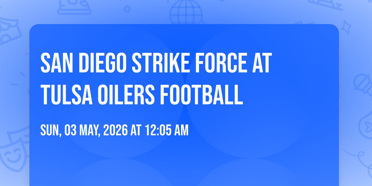 π Location: 36.1527, -95.9964π Step into a world of wonder at San Diego Strike Force at Tulsa Oilers Football, where extraordinary moments await! ποΈ Located at BOK Center in dynamic Tulsa, OK, this event will become the talk of the town. π Join us on May 3rd, 2026 at 12:05 AM for a celebration that defies the ordinary. β¨ This curated experience brings together the best of entertainment, culture, and community spirit. Every detail has been thoughtfully planned to ensure an unforgettable experience for all our guests. π― Take advantage of this opportunity to be part of something special. π Early registration is recommended as space is limited!