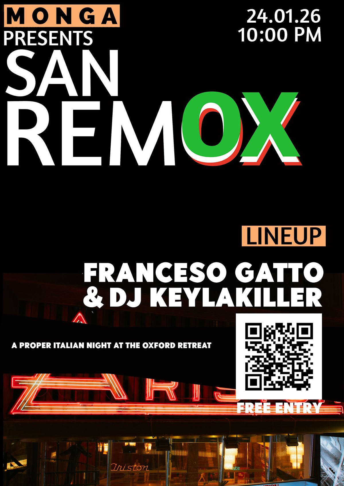 Behind the decks, DJ Francesco Gatto (Milan) and Keylakiller will deliver a carefully crafted DJ set moving between old-school favourites and contemporary Italian tracks, keeping the dancefloor alive from start to finish.