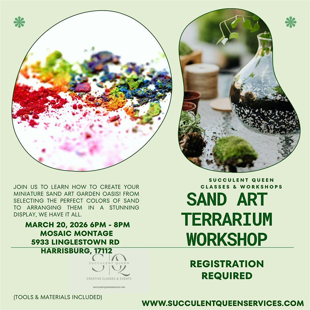 Join us at Mosaic Montage on March 20, 2026 at 1:00 PM (ET) for a fun, hands-on Sand Art Terrarium workshop! Get creative and build your own colorful mosaic masterpiece in a relaxed, friendly vibe. Perfect for all skill levels—come ready to make something awesome and take home a unique piece of art. Can't wait to see you there!