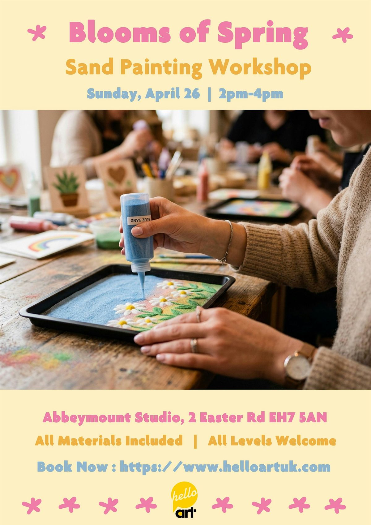 Step into a soft and playful creative space and welcome the feeling of spring 🌿 In this calming workshop, you’ll use colourful sand to design and create your own delicate flower artwork, inspired by the lightness and freshness of the season.
