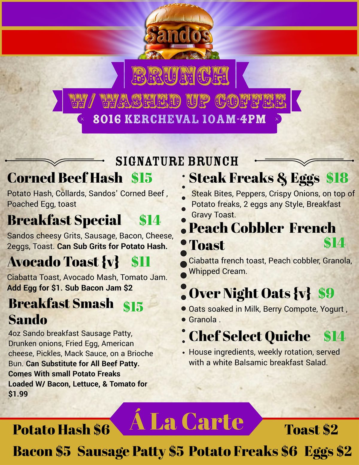 Sandos is Doing Brunch! Come through and enjoy some of our soecialties, Sandos Brwakfast Smash , and our Steak N Freaks ! every Sunday At LaFoundaStreet sharing the building with Washed Up Coffee!