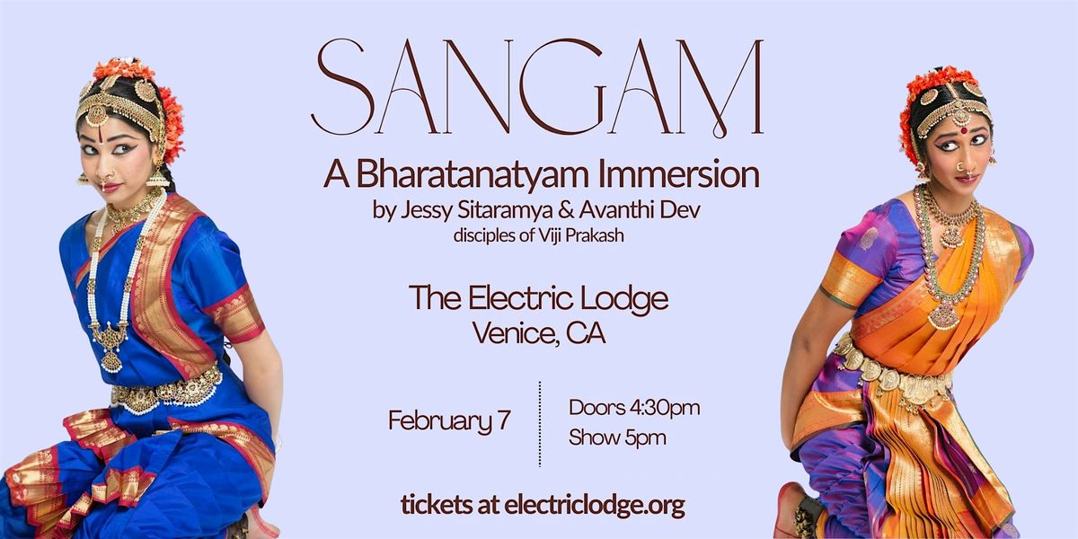 Jessy Sitaramya and Avanthi Dev, students of Viji Prakash and the Shakti School of Bharatanatyam, present Sangam - A Bharatanatyam Immersion. Sangam is a collection of compositions that explore the facets of Bharatnatyam - pure dance, storytelling, and drama. The artists completed their arangetrams (solo dance debuts) in 2015 and 2016, and are currently working professionals in Seattle and Los Angeles. Jessy and Avanthi are excited to come together at The Electric Lodge on February 7th and share an evening of music and dance.