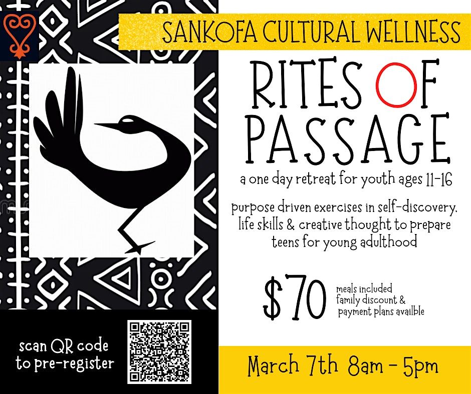 Join us in person for the Sankofa Rites of Passage Retreat! This special gathering is all about embracing cultural heritage, growth, and connection. Dive into purpose-driven exercises in self-discovery, life skills, and creative thought that celebrate the journey of becoming a young adult. Boys and girls between the ages of 11 and 16 will be guided throughout the retreat by professional youth and cultural advocates. Fee includes all meals and supplies.