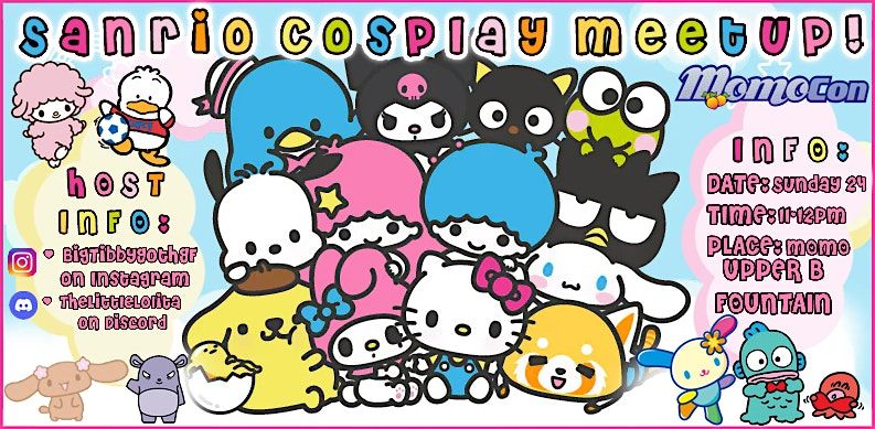 Hello, and thank you for showing interest in this meetup to have a look! All of the Sanrio Fans, come and join us at the UPPER B FOUNTAIN (Before the project Sekai Photoshoot Meet) to take, photos, make friends, and love Sanrio!No set cosplay is required, there is no specific cosplay fills, but if you wish you can take from the options for ideas that I have listed here!If you have interest in filling spots to help you pick what you wish to do, just message me and let me know^^