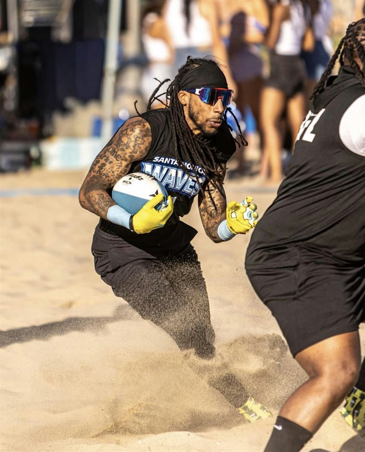 The Santa Cruz Beach Classic is a high-energy, full-contact beach football showdown at the iconic Santa Cruz Beach Boardwalk—featuring the Santa Monica Waves vs. Santa Cruz Tsunamis, led by NFL legends including Marshawn Lynch and DeShaun Foster, with a live halftime performance by Goapele, celebrity appearances, and nonstop summer vibes.