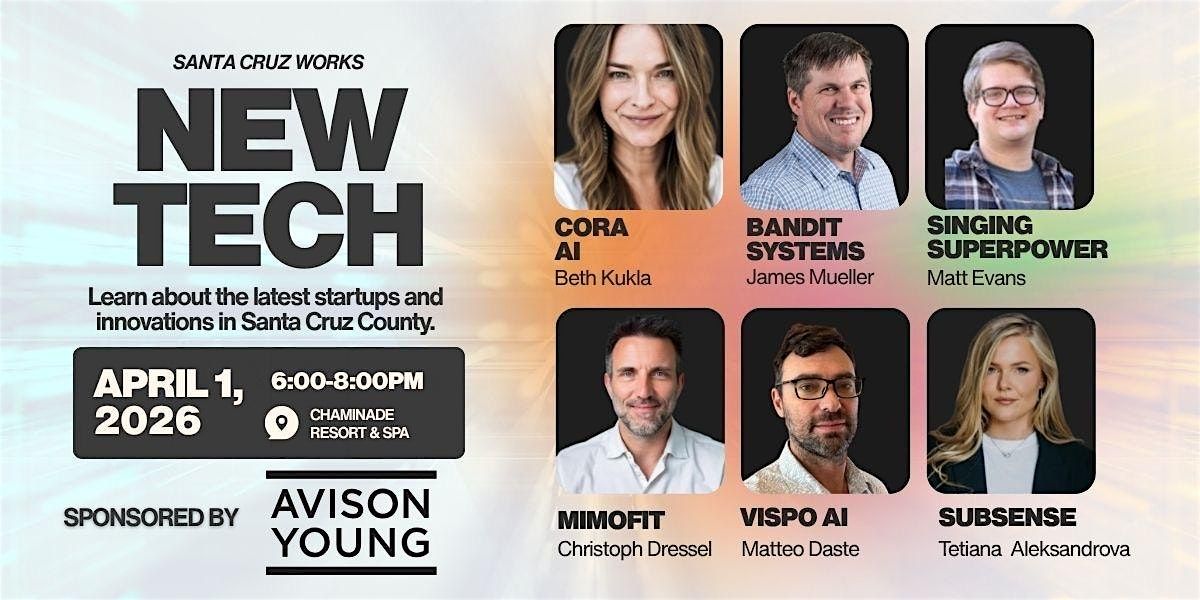 Join us on April 1 for Santa Cruz Works New Tech, returning to Chaminade for another evening of fresh ideas, smart people, and the kind of rapid-fire innovation that makes it hard to stay cynical for five full minutes. The first hour is all about connection: appetizers, beverages, networking, exhibits, and live music are all included with your event ticket. Then, at 7:00 pm, we shift into founder mode with a lineup of fast-paced presentations from companies and researchers tackling security, health, legal tech, behavioral AI, and even the mysteries of music and memory. But first, our effusive thanks to sponsor: Two Santa Cruz natives will bring glory and fame to this event.