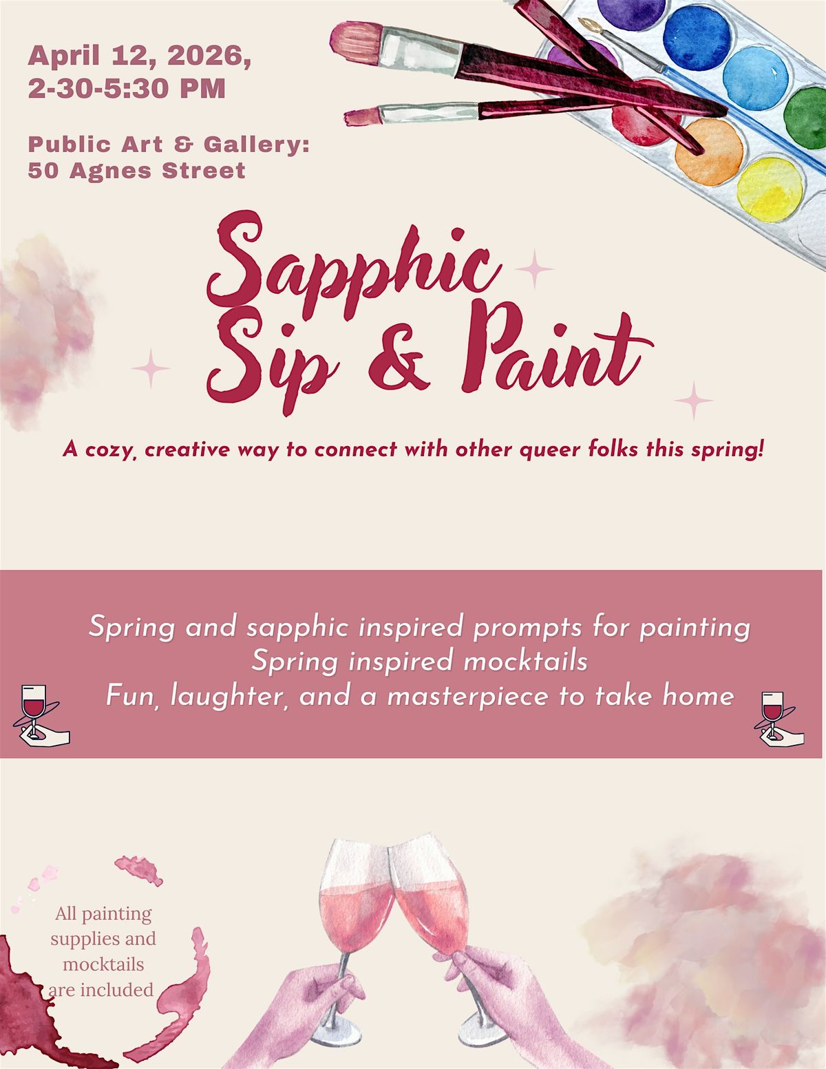 Join us on Sunday, April 12th from 2:30-5:30PM at Public Shop & Gallery for a sapphic-centered sip & paint filled with creativity, conversation, and community.