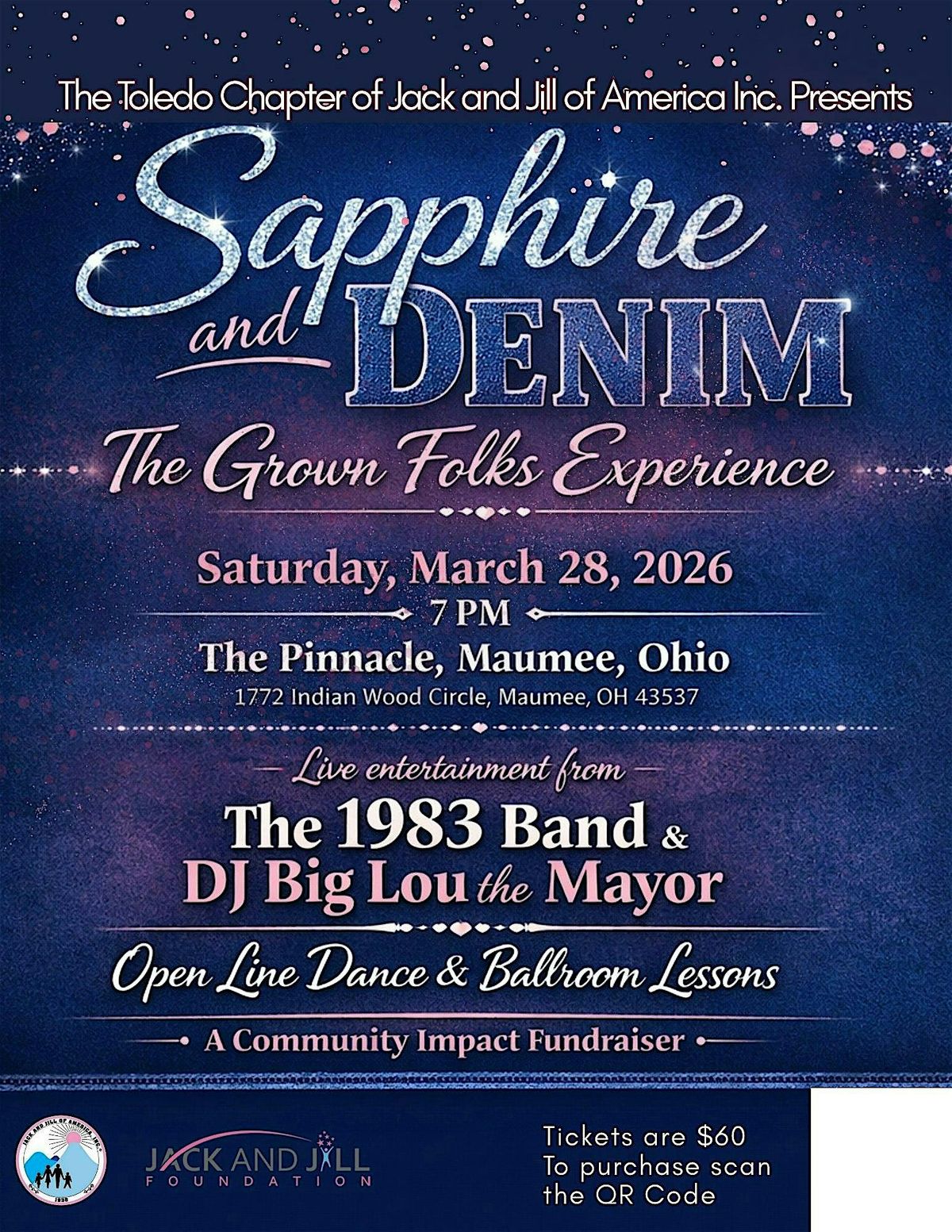 The Toledo Chapter of Jack and Jill of America Incorporated is proud to bring you Sapphire and Denim: The Grown Folks Experience. We're bringing back the fundraising event you've always known and loved. However, we're elevating this experience to feature live music by the 1983 Brand to start the evening. As the evening progresses, we will dance the night away with DJ Big Lou The Mayor! There will be line dance and ballroom lessons and heavy hors d'eourves.