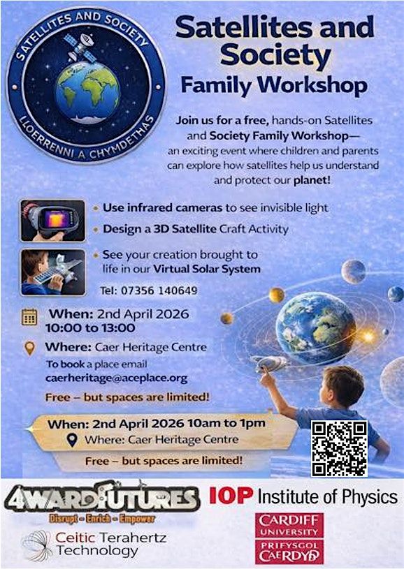 Join us for a free, hands-on Satellites and Society Family Workshop where children and parents/carers explore how satellites help us understand and protect our planet. Families will discover how satellites observe Earth, use infrared cameras to see invisible light, design and build their own model satellites and see your creations in a virtual solar system. This fun, interactive workshop is designed for families with children aged 8–13, combining science, creativity and teamwork to show how careers in space science, engineering and technology can help make a positive difference to our world.