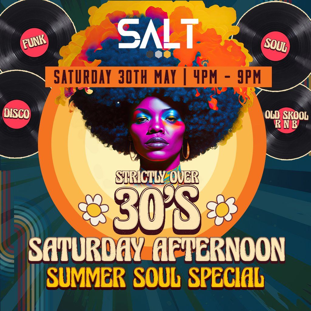 Strictly over 30s Saturday afternoon soul party at SALT: funk, disco & old school RnB with live singer, DJs, dancers and summer vibes.Music Genres : R&B, Soul, Funk, Disco