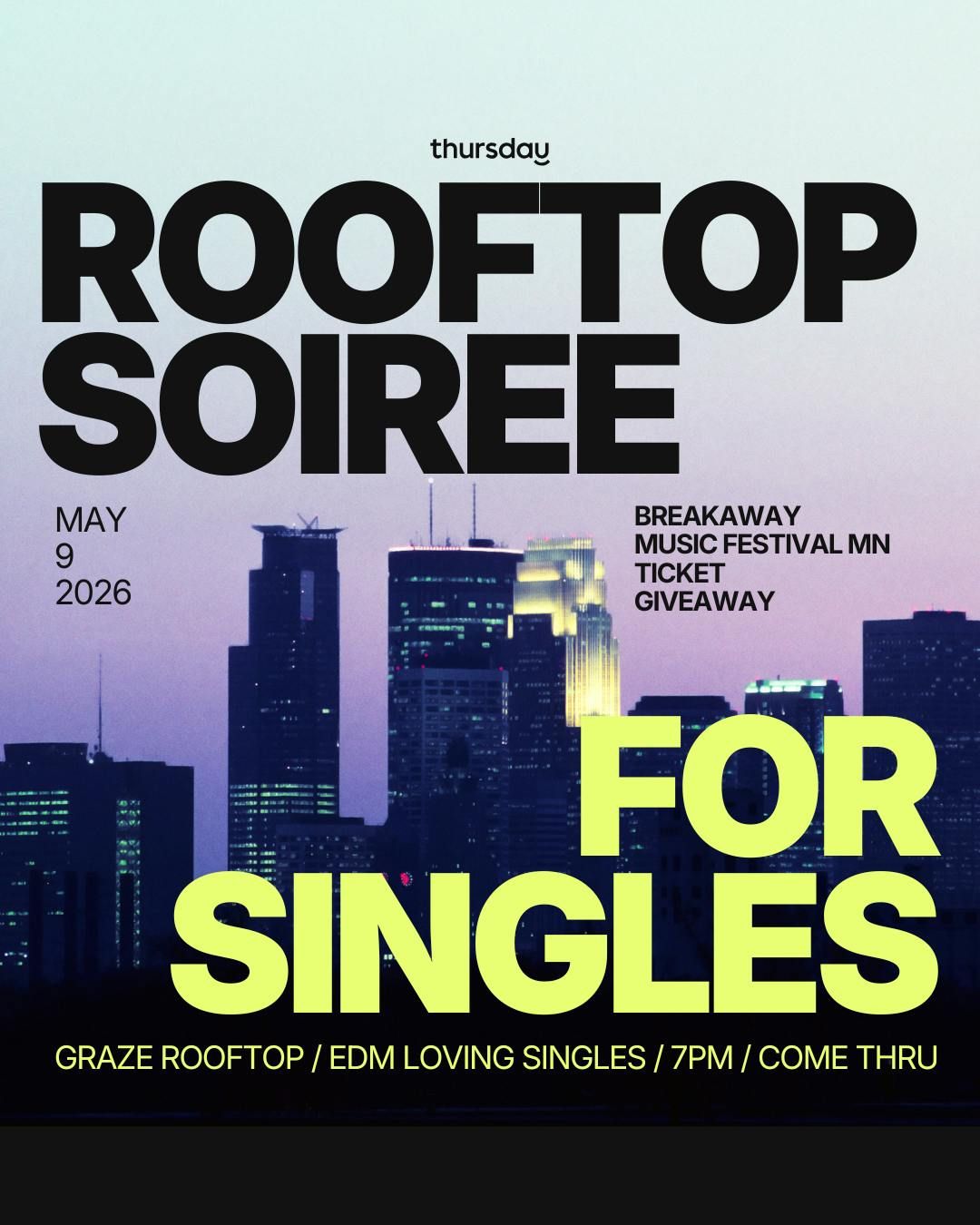 ⏰ SATURDAY, MAY 9th | 7PM-10PM | GRAZE ROOFTOP✨ROOM FOR UP TO 200 SINGLES ✨YOUR TICKET TO THIS EVENT IS AN ENTRY TO WIN FREE BREAKAWAY MN FESTIVAL TICKETS
