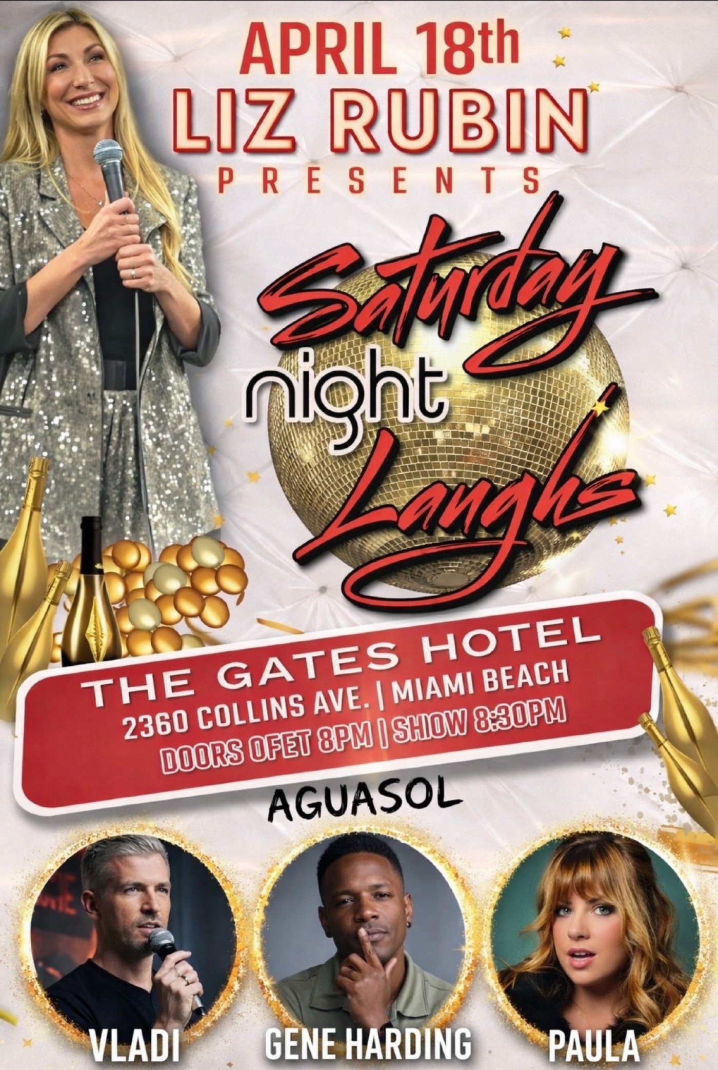 Saturday Night Laughs returns to The Gates Hotel South Beach on Saturday, April 18, from 8-10 p.m., bringing the SNL vibe to Miami with host and producer Liz Rubin, a veteran stand-up comedian with 15+ years of experience who has shared the stage with Jerry Seinfeld and Jim Gaffigan. The evening is headlined by Gene Harding, the creator and star of the viral comedy series “Hey Doc,” known for his high-energy and unapologetically edgy comedy. Also featured is Paula Barros, the voice of Univision’s top-rated daytime show, Desiguales, and voted as Best Comedian of 2024 by Miami New Times, along with Vladi Yurovsky, co-producer of monthly comedy shows at The Apothecary 330. This 21+ event promises nonstop laughs in an intimate hotel setting with complimentary tastings from Aguasol Tequila. Paid parking is available at the venue. General admission is $25 with a two-for-one deal for $20 each.