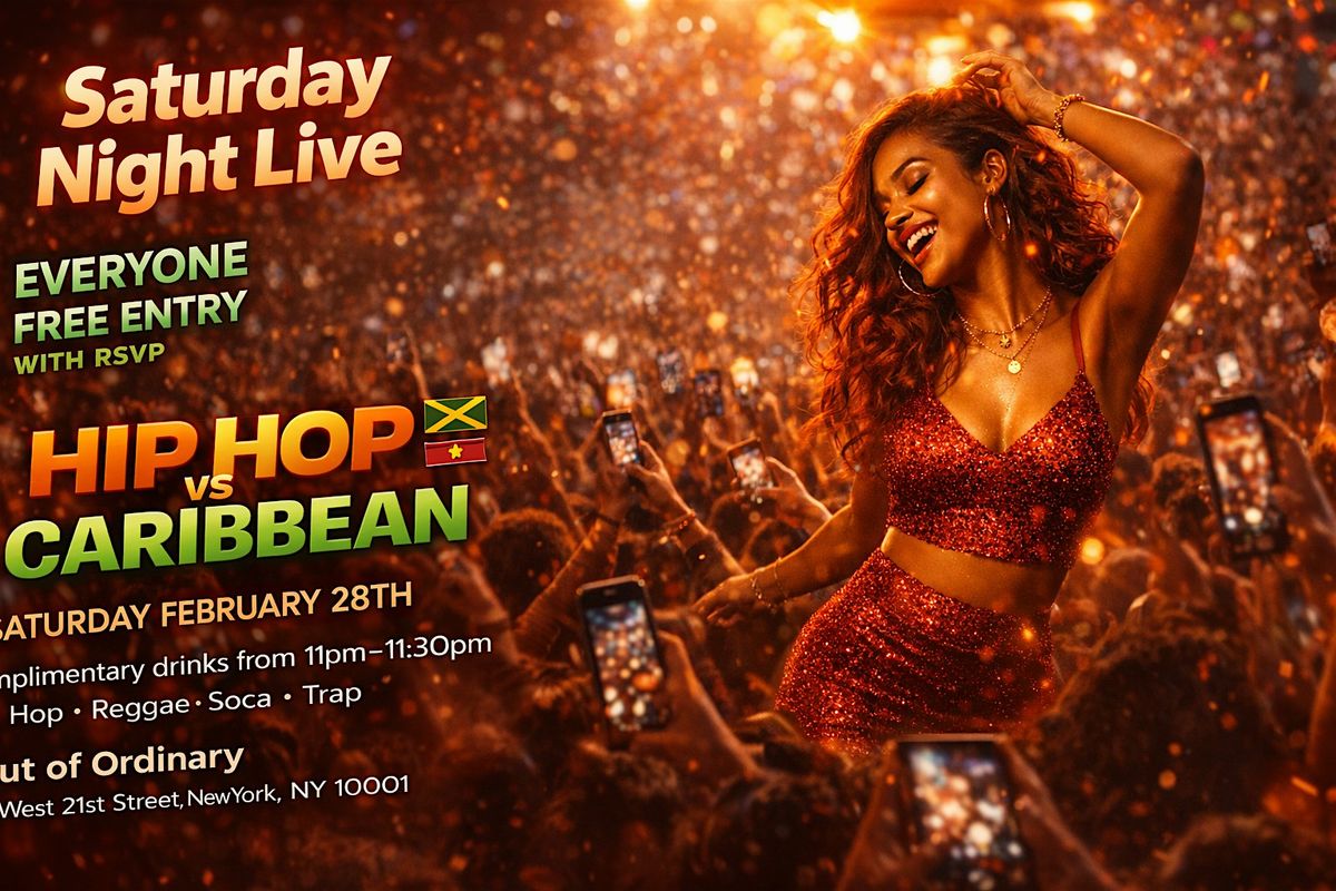 Saturday Night Live: Hip Hop vs Caribbean is a high-energy NYC nightclub party at Out of Ordinary in Manhattan. Enjoy hip hop, reggae, soca, and Caribbean vibes all night, everyone free entry with RSVP, and complimentary drinks from 11PM–11:30PM. Perfect for groups, birthdays, and a fun Saturday night out in New York City.