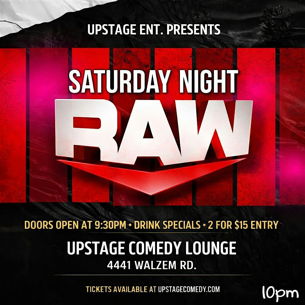 Get ready for a night full of laughs at SATURDAY NIGHT RAW! This is the perfect chance to kick back, enjoy some killer jokes, and soak up the vibes in person. Join us for an evening where comedy takes center stage and good times are guaranteed. Don’t miss out on the fun – bring your crew and let’s laugh the night away!