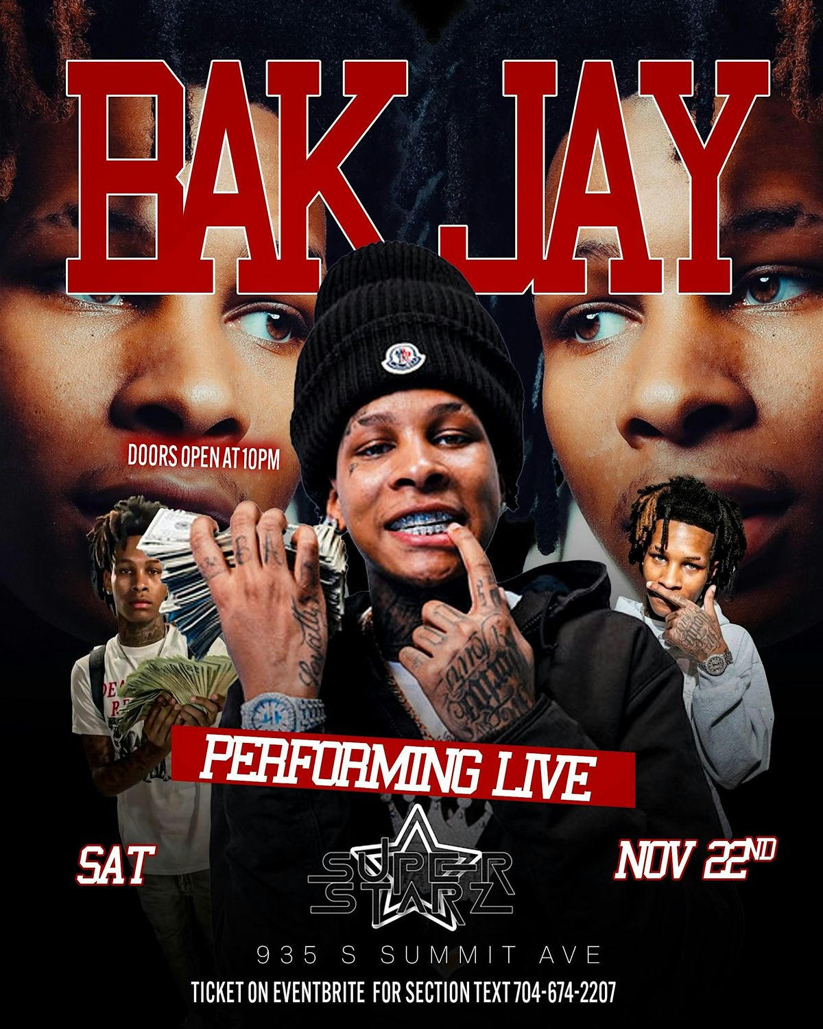 Saturday Nov 22nd @BakJay performing live Text 704-674-2207 For Tables Only at superstarz