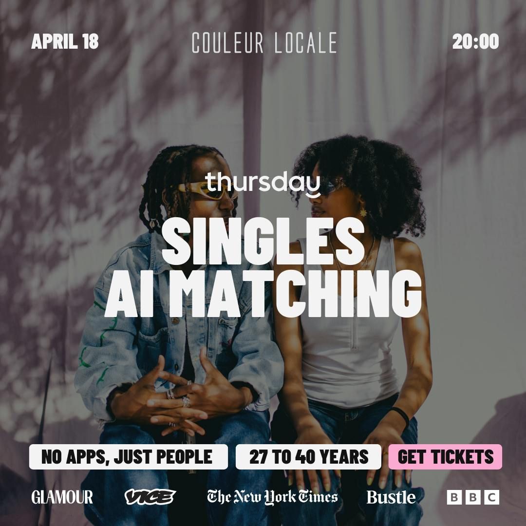 🔞 Age restriction: 27–40 years.🌟 100 Singles. One Venue.🫶 Arrive with your AI matching ticket before 21:00. Arrive after 22:30 with your social ticket.🪪 Physical ID required. No refunds.🥰 Most people (70%) come on their own, so you’ll fit right in.🤝 Our Thursday hosts will be present during the event to ensure you have a great evening.