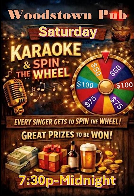Get ready for a night of fun and singing at Woodstown Pub Off Main! Join us on March 21, 2026 at 7:30 PM (Eastern Time) for Spin the Wheel Karaoke. Whether you're a shower singer or a stage pro, this event is all about good vibes and great tunes. Bring your friends, grab a drink, and take your chance to spin the wheel and win cash and prizes or simply pick your own song! 7:30pm-Midnight Saturday's