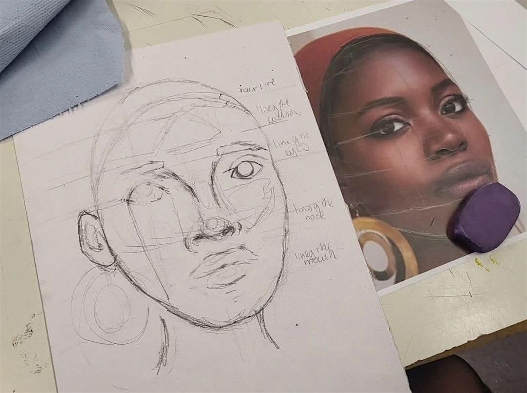 You will learn to draw and paint portraits of people with different features and different cultural backgrounds. You will then create a self-portrait using Tina Ramos Ekongo’s signature technique of acrylic on cardboard and a limited palette of colours – regardless of the colour of your skin.