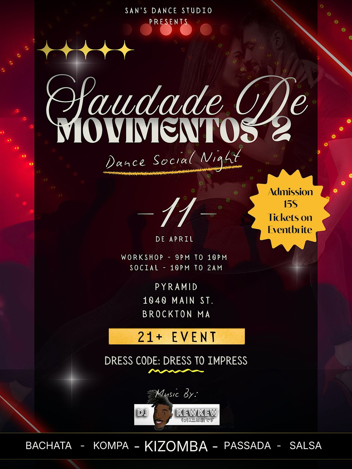 Kizomba workshop followed by a dance social night after class. Experience the beauty of the culture of Kizomba, which originated in Angola. Don’t miss out on this special experience! 💃🏾🕺🏾✨ @sansdancestudio_