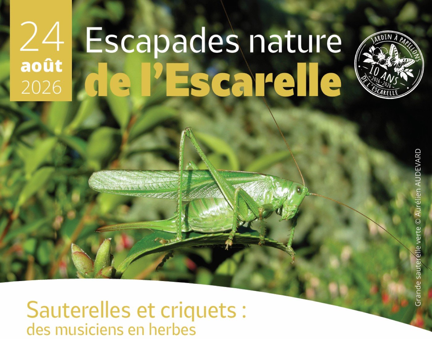 Au cours d’une sortie nature conviviale, partez à la découverte de ces insectes fascinants. Apprenez à les reconnaître grâce à l’observation directe sur le terrain et à l’écoute attentive de leurs chants caractéristiques.