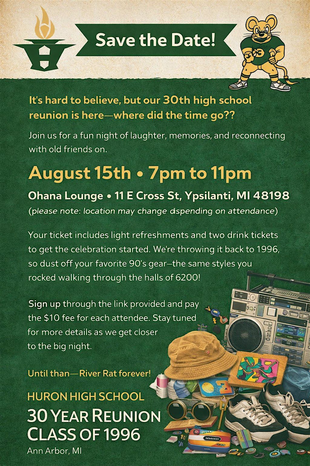 Save the Date! It’s hard to believe, but our 30th high school reunion is here—where did the time go??