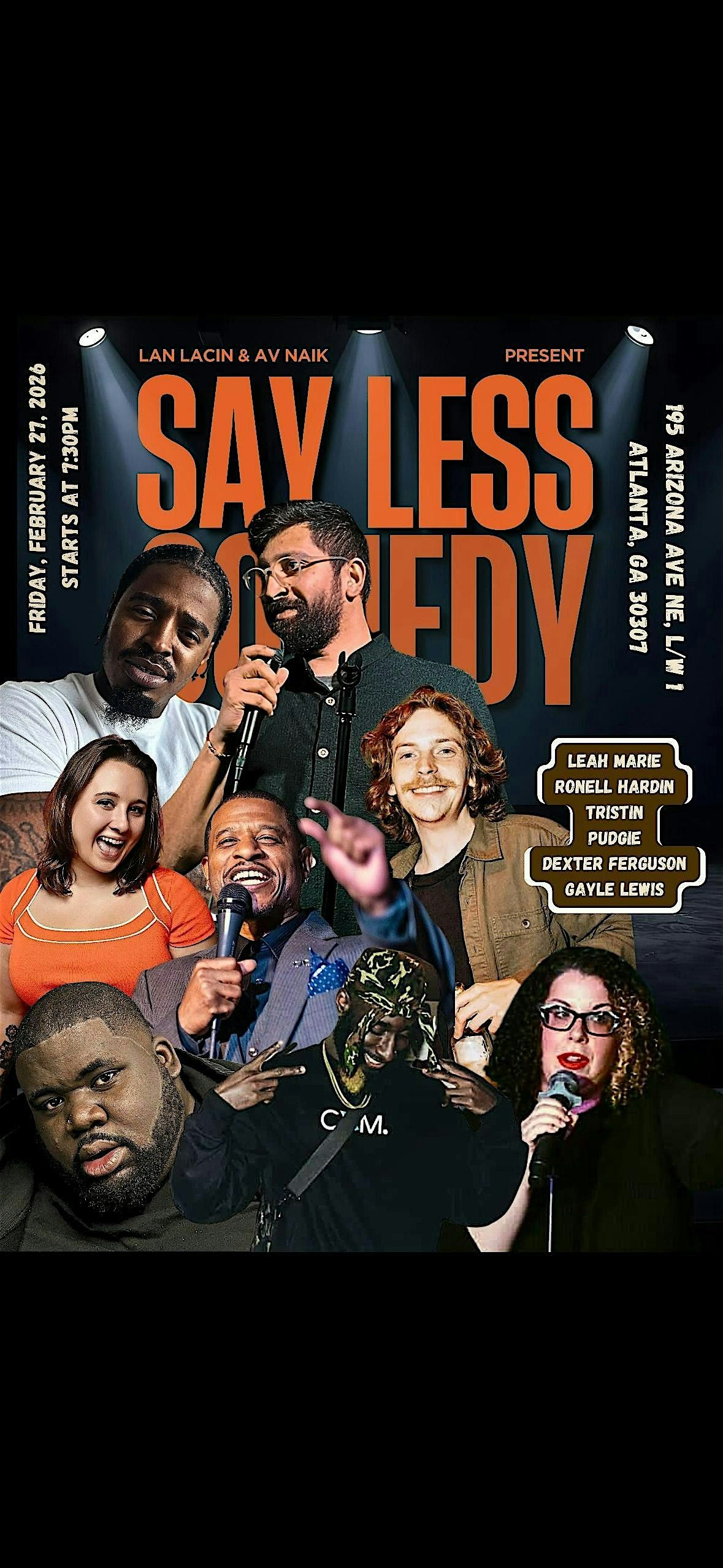 Get ready for a night full of laughs at SAY LESS COMEDY! Join us in person for some top notch stand up, hilarious jokes, and a unique vibe that’s all about good times. The aura is unmatched! Bring your friends, kick back, and enjoy comedy like never before. Don’t miss out and SAY LESS!!