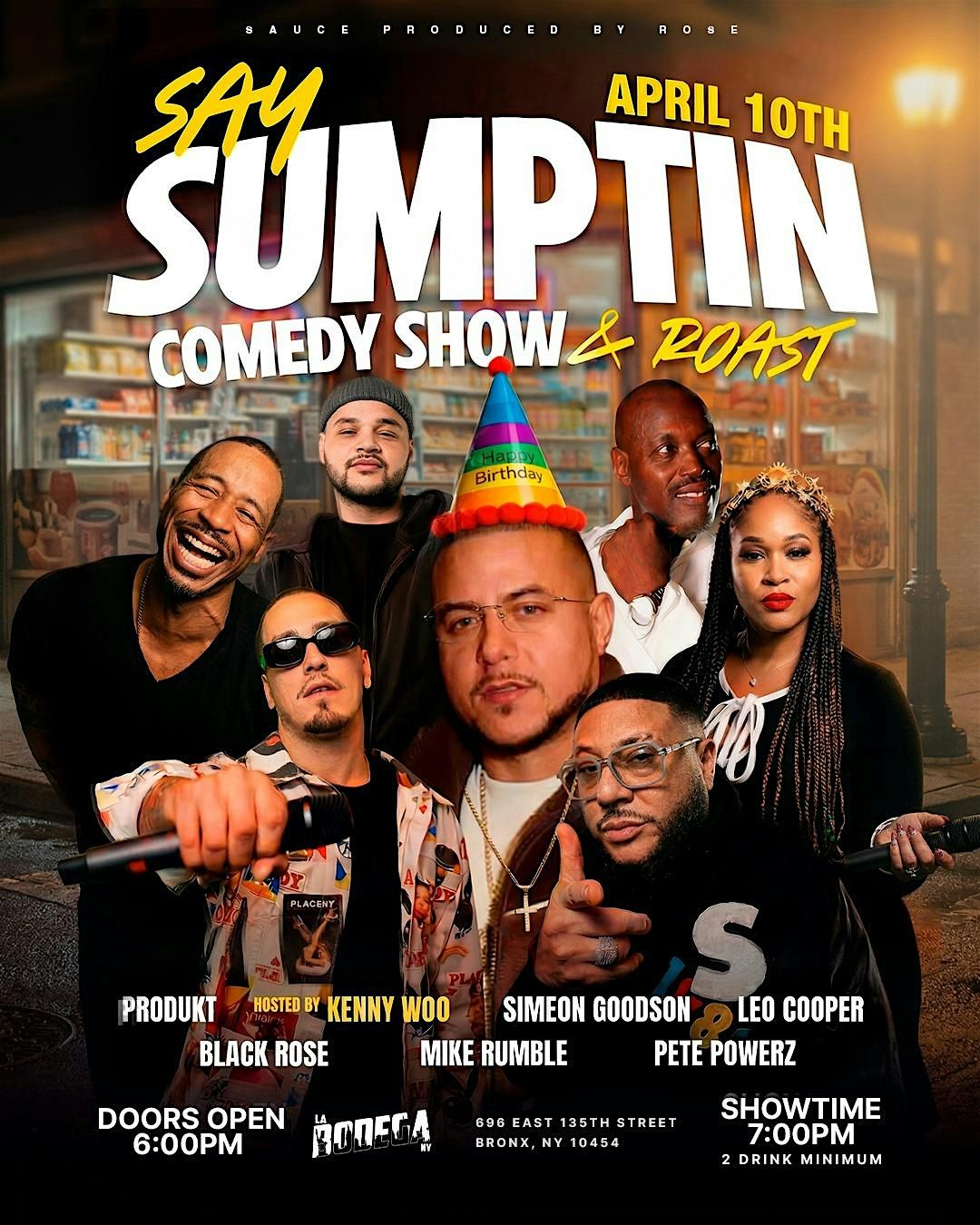 say Sumptin Comedy Hostrd by ComedIan Woo! Features Simeon Goodson & Leo Cooper with a roast session at the end with Black Rose, Mike Rumble and Pete Powerz homering PRODUKT from La Bodega!