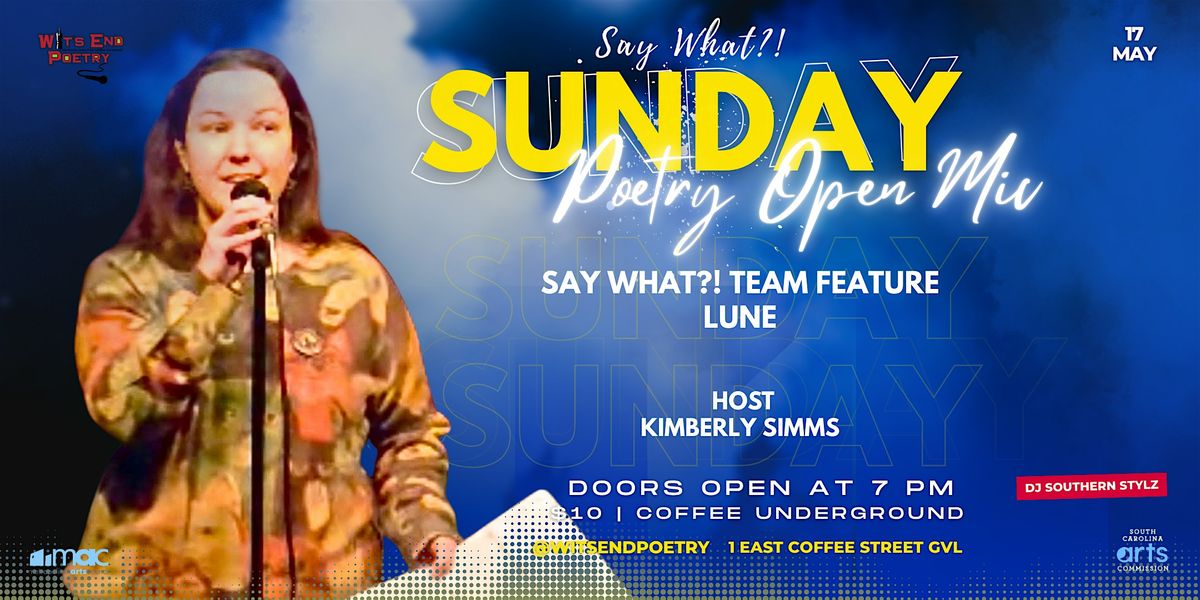 Say What?! Open Mic at Coffee Underground featuring team member Lune of Greenville, SC! All poetry styles welcome! The night will also feature a full night of open mic slots for local poets on a first-come, first serve basis. Host Kimberly Simms.