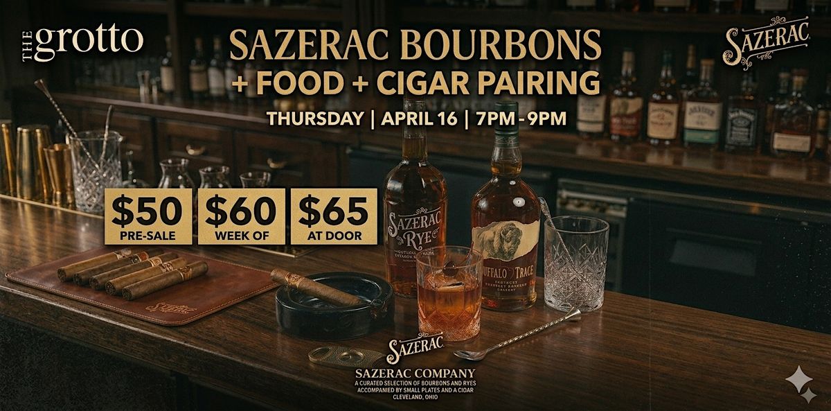 Join us at The Grotto at Barley House for an elevated bourbon, cigar, and food-pairing experience. Enjoy curated Sazerac tastings, premium cigars, and thoughtfully paired bites in an intimate, lounge-style setting.