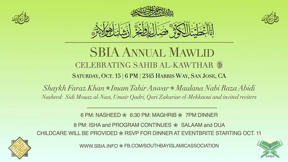 Assalamu Alaykum,InshaAllah, SBIA will hold its annual Mawlid celebration on Saturday, October 15. This year's event marks a return to the scale prior to the pandemic, InshaAllah. In order to ensure that we are able to serve the community well, we would like you to RSVP for dinner using Eventbrite. Dinner RSVPs will open at 12:30 pm on Tuesday, October 11.