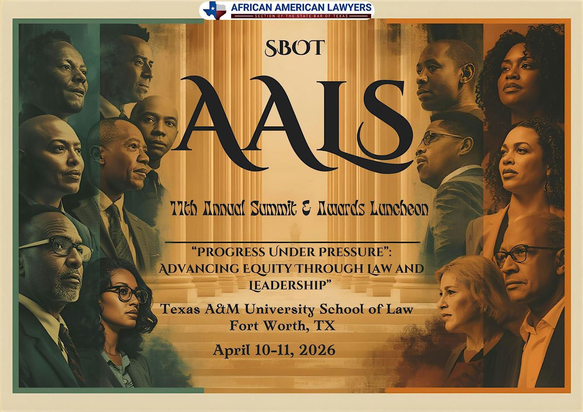 Join the State Bar of Texas African American Lawyers Section for the 11th Annual AALS Summit & Awards Luncheon, April 10–11, 2026, at Texas A&M University School of Law in Fort Worth. This premier two-day event convenes attorneys, judges, law students, and legal professionals from across Texas and beyond for meaningful connections, professional growth, and celebration.