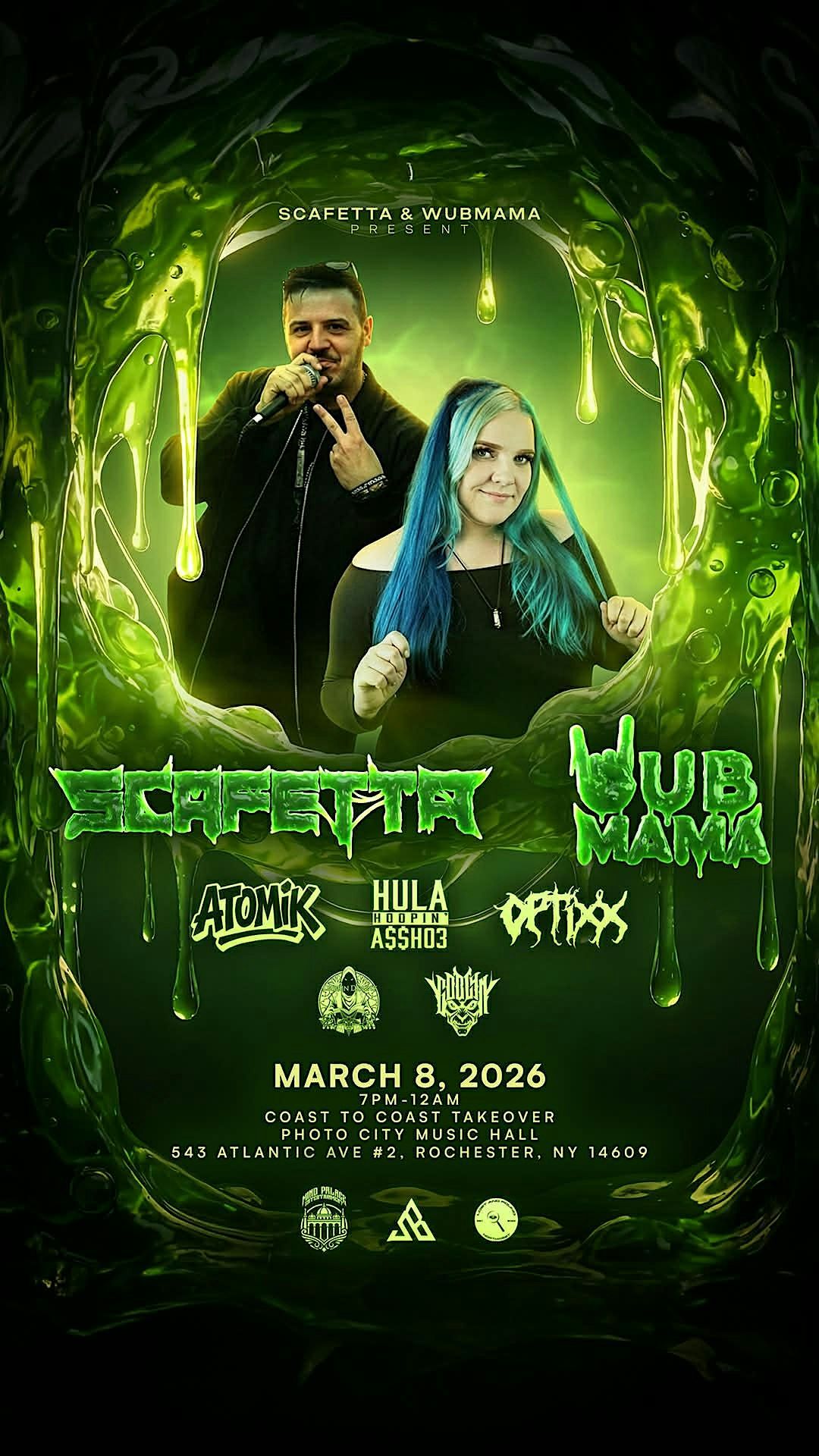 The Scafetta & Wubmama tour lands in Rochester, NY for a high-voltage night of bass culture, community, and pure sonic pressure. From coast to coast, this show is about shared frequency—no half-steps, no holding back, just full-send sound built to move bodies and rattle walls.