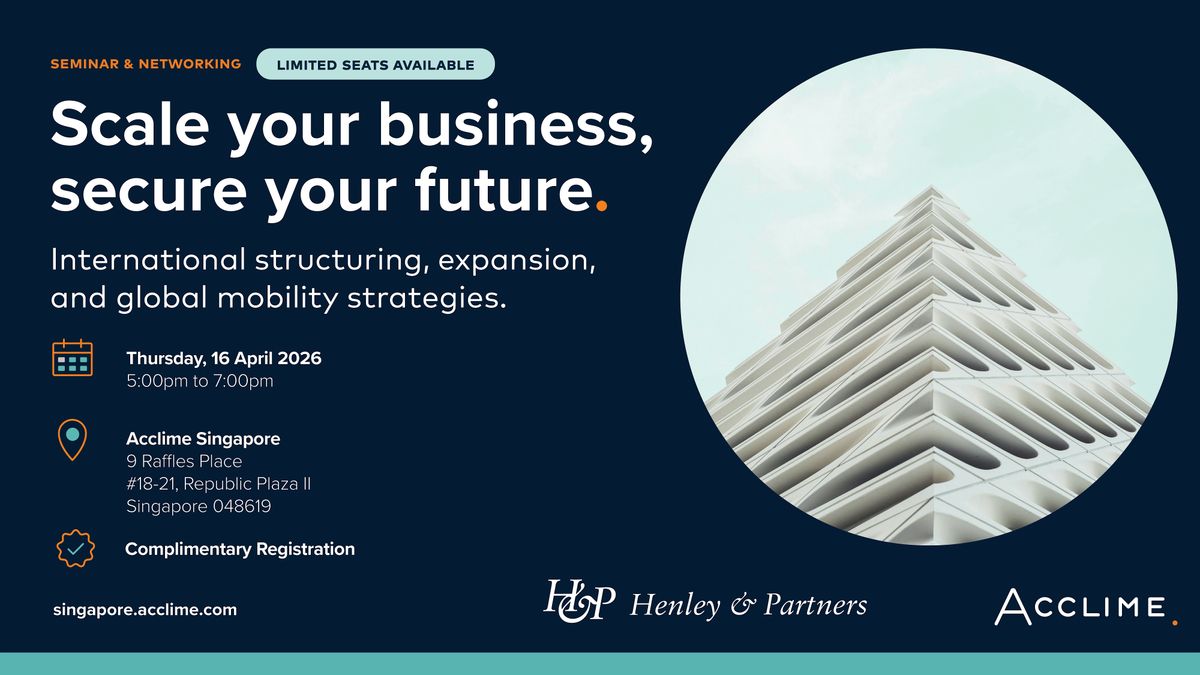 In an increasingly uncertain global environment, founders and executives are rethinking how best to position their businesses and themselves for long-term success. Singapore stands out as a strategic base for international expansion, tax efficiency, and regulatory stability, enabling companies to scale, invest, and protect long-term interests. Jointly organised by Acclime and Henley & Partners, this seminar explores how to structure across borders, optimise tax, and align business growth with global mobility, succession planning, and wealth preservation, helping you build resilience and unlock opportunities across jurisdictions.