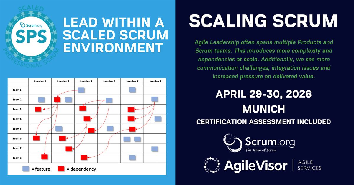In this 2-day Scaled Professional Scrum (SPS) workshop, students will simulate a large software development project using the Nexus™ framework. The workshop is delivered using an end-to-end case study where students work together to organize and simulate a scaled software development project. Throughout the workshop, students will be introduced to more than 50 practices that can be used to help reduce complexity and dependencies at scale.