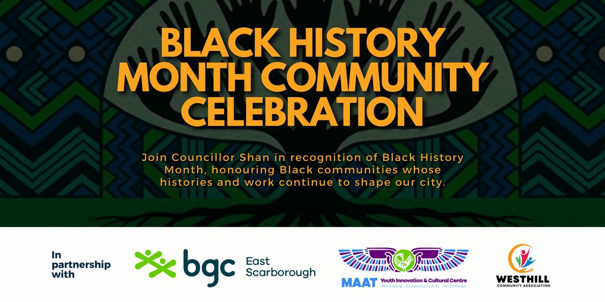 Join Councillor Shan, West Hill Community Association, East Scarborough Boys and Girls Club, and MAAT Youth Innovation and Cultural Centre in recognition of Black History Month, honouring Black communities whose histories, resistance, and community building continue to shape our city. Together, we gather to recognize the ongoing work of Black communities in building a more just and inclusive Toronto.