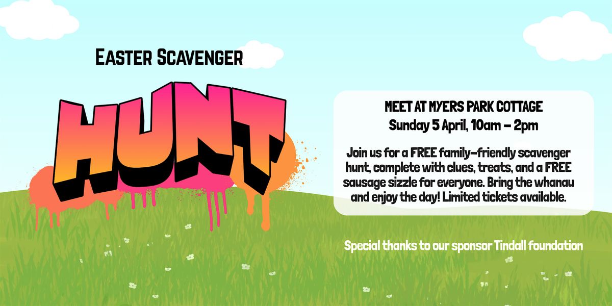 Join us this Easter Sunday for a FREE family-friendly scavenger hunt through historic Myers Park! Bring the whānau, roam through the park and hunt down the clues, snap photos—and make your way back to Myers Park Cottage for sausage sizzle and to claim an easter surprise.