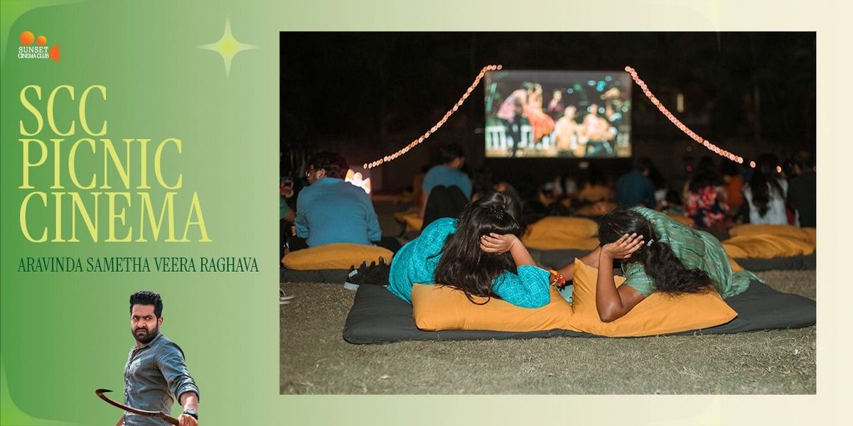 Watch this Telugu action drama starring N.T. Rama Rao Jr. and Pooja Hegde, where Veera Raghava strives to end a long-standing village feud through peace. Enjoy an open-air movie night with Sunset Cinema Club in a cozy picnic-style setup with lush grass, warm lights, bean bags, mattresses, and good sound.
