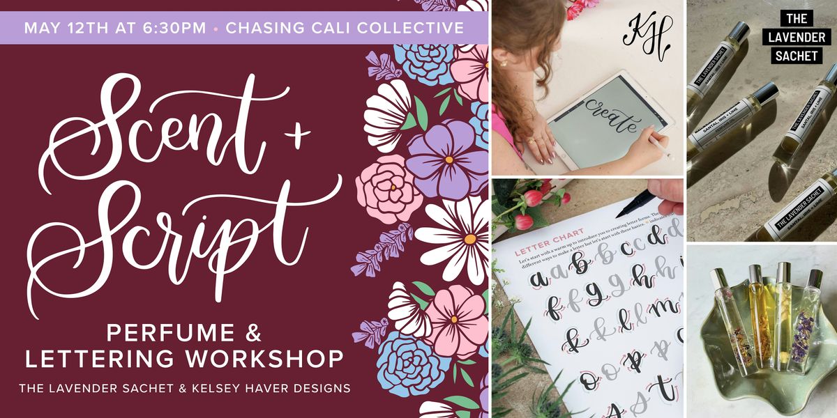 Each ticket includes both a custom perfume-making workshop and a modern handlettering class, held at the beautifully styled Chasing Cali Collective event space. You’ll enjoy one workshop, take a short break, and then dive into the second — creating something personal and memorable together.