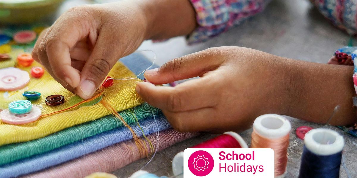 [Image Description: Digital image of hand threading a needle, sewing fabric and equipment. Text reads School Holidays. ]