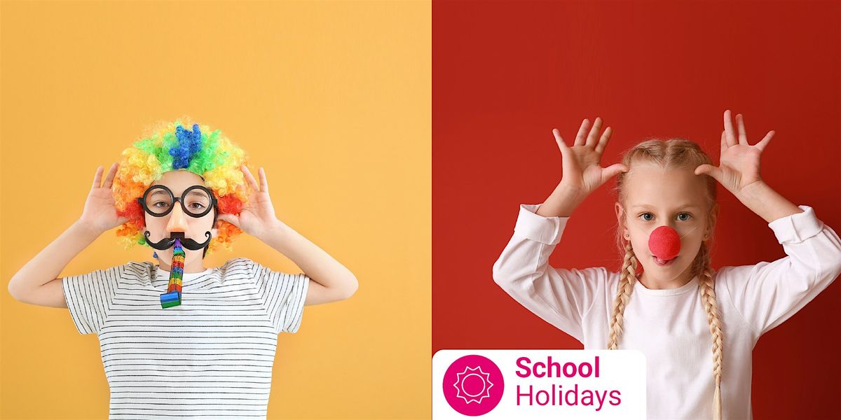 [Image Description: photo of children wearing clown nose and costume. Text reads School Holidays. ]