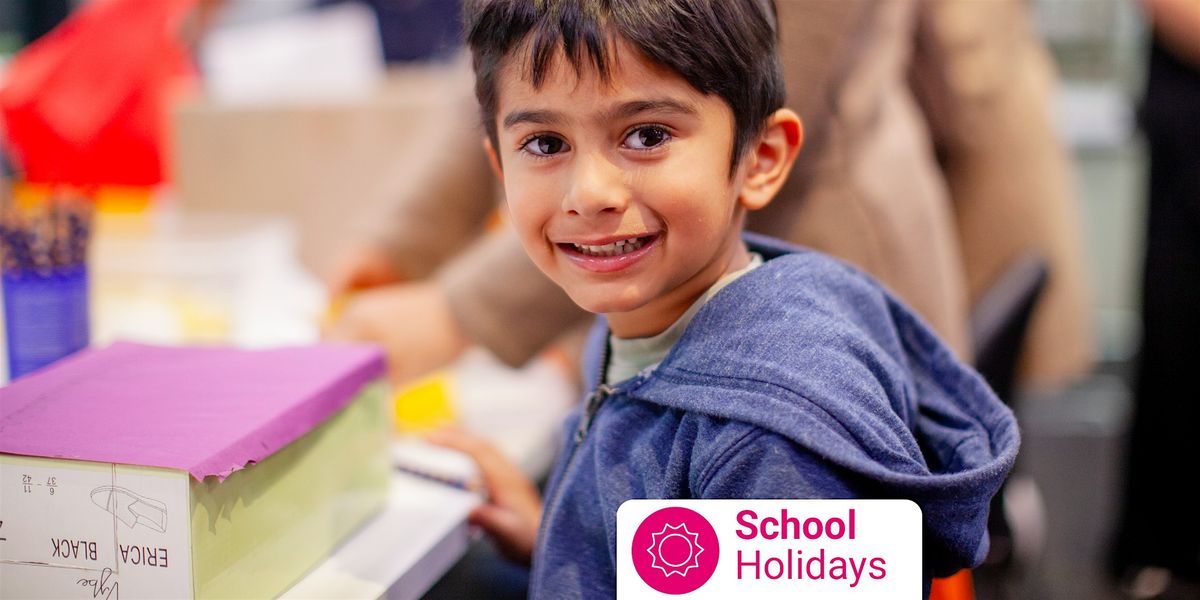 [Image Description: photo of child making crafts in library. Text reads School Holidays. ]