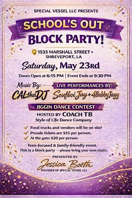 Get ready to kick off the summer with our School's Out Block Party! Join us in person for a day full of fun, music, food, and good vibes. It’s the perfect way to celebrate the end of the school year with friends and family. Don’t miss out on great food, live DJ, local performers and dancing contest. See you there!