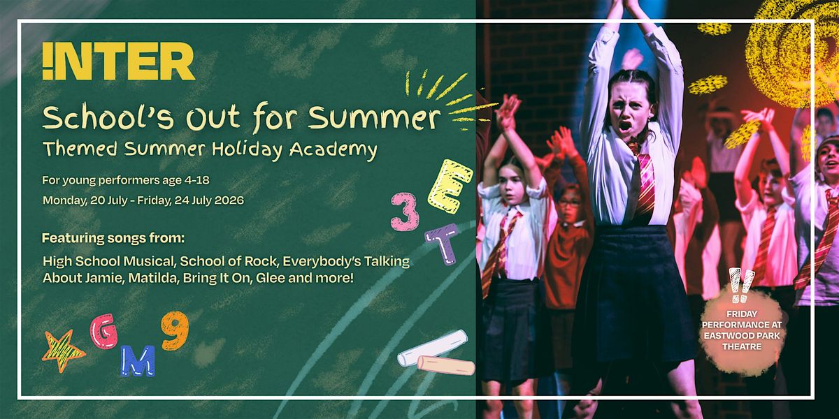 Join us at our 'School's Out For Summer' Summer Holiday Academy, where students will rehearse and perform songs and dances from High School Musical, School of Rock, Everybody’s Talking About Jamie, Matilda, Bring It On, Glee and more! The week wraps up with a vibrant performance in Eastwood Park Theatre, where you can take to the stage and shine!