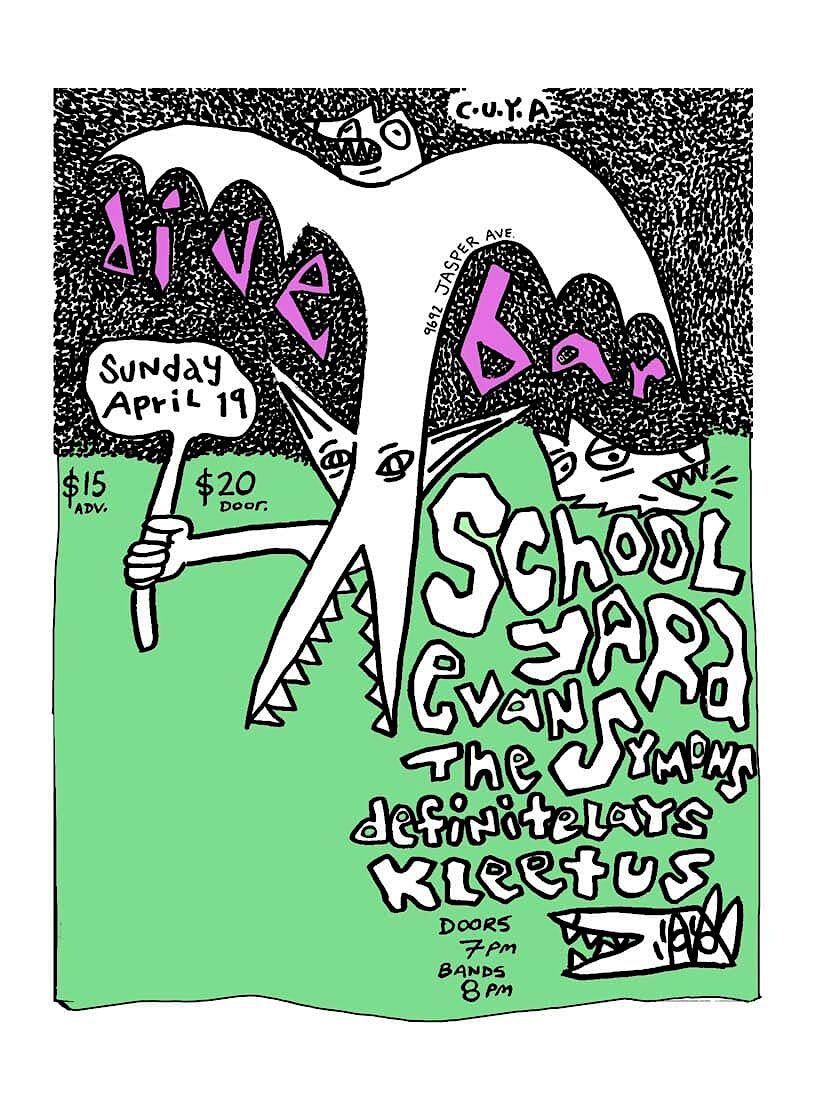 School Yard headlines the eccentric night of indie rock. BC outsider Evan Symons , Saskatoon's The Definitelays and Kleetus