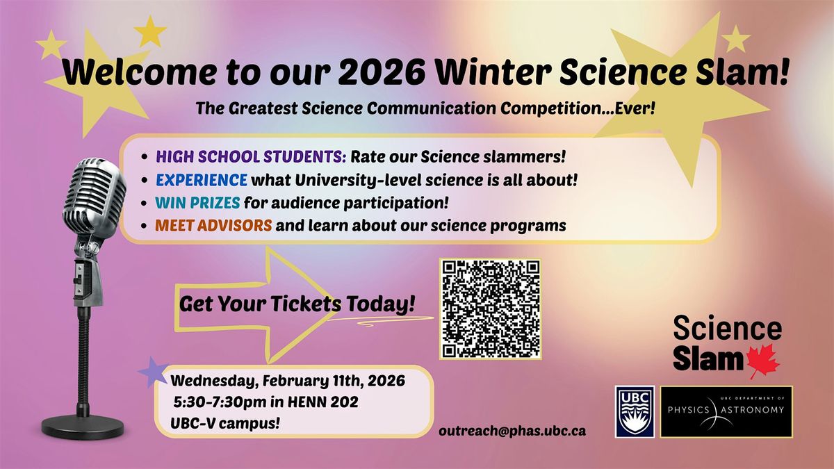 We invite high school students and their families to join us and cheer on our slammers! Staff advisors and faculty will be available on-site to answer questions about our programs, courses and more about physics and astronomy. High school students have the chance to engage with undergraduate science students and ask questions about research opportunities, jobs, and university life in the Faculty of Science at UBC.