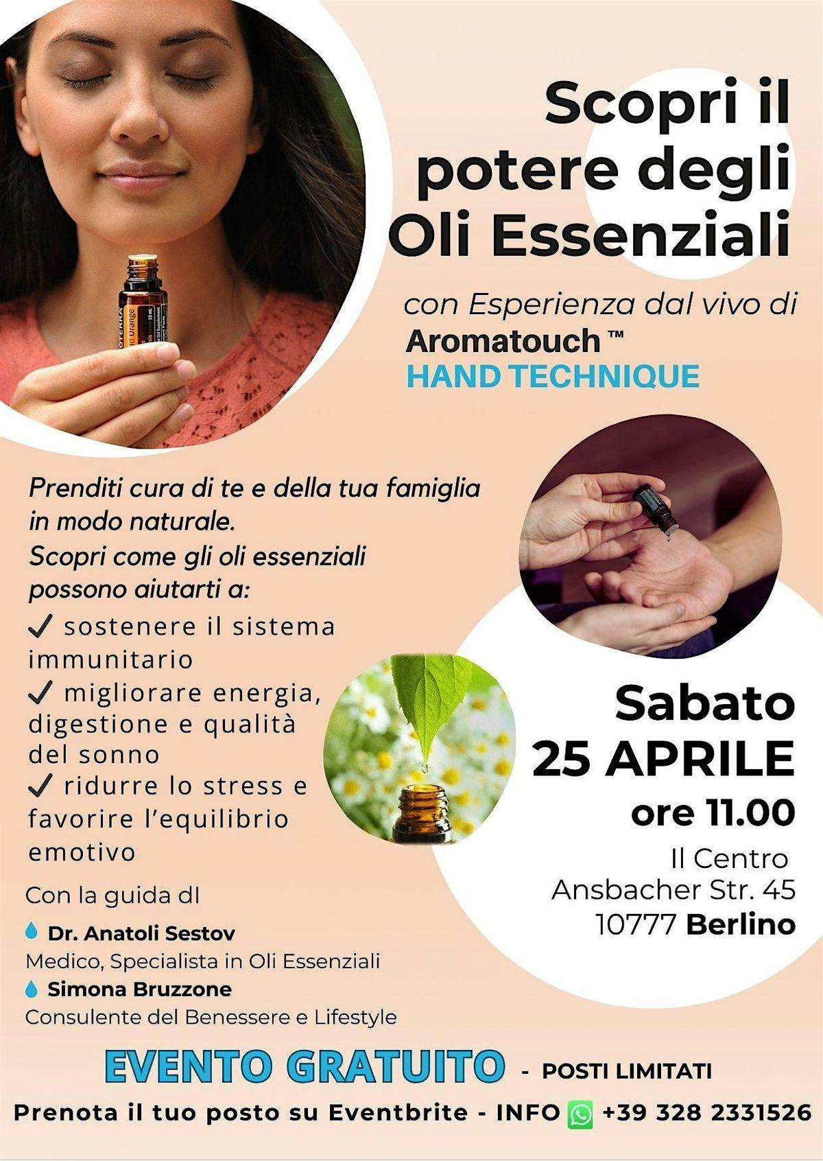 Ti aspettiamo a Berlino per un workshop esperienziale di Aromaterapia, dove potrai scoprire come utilizzare gli oli essenziali nella vita quotidiana per prenderti cura di te e della tua famiglia in modo naturale.