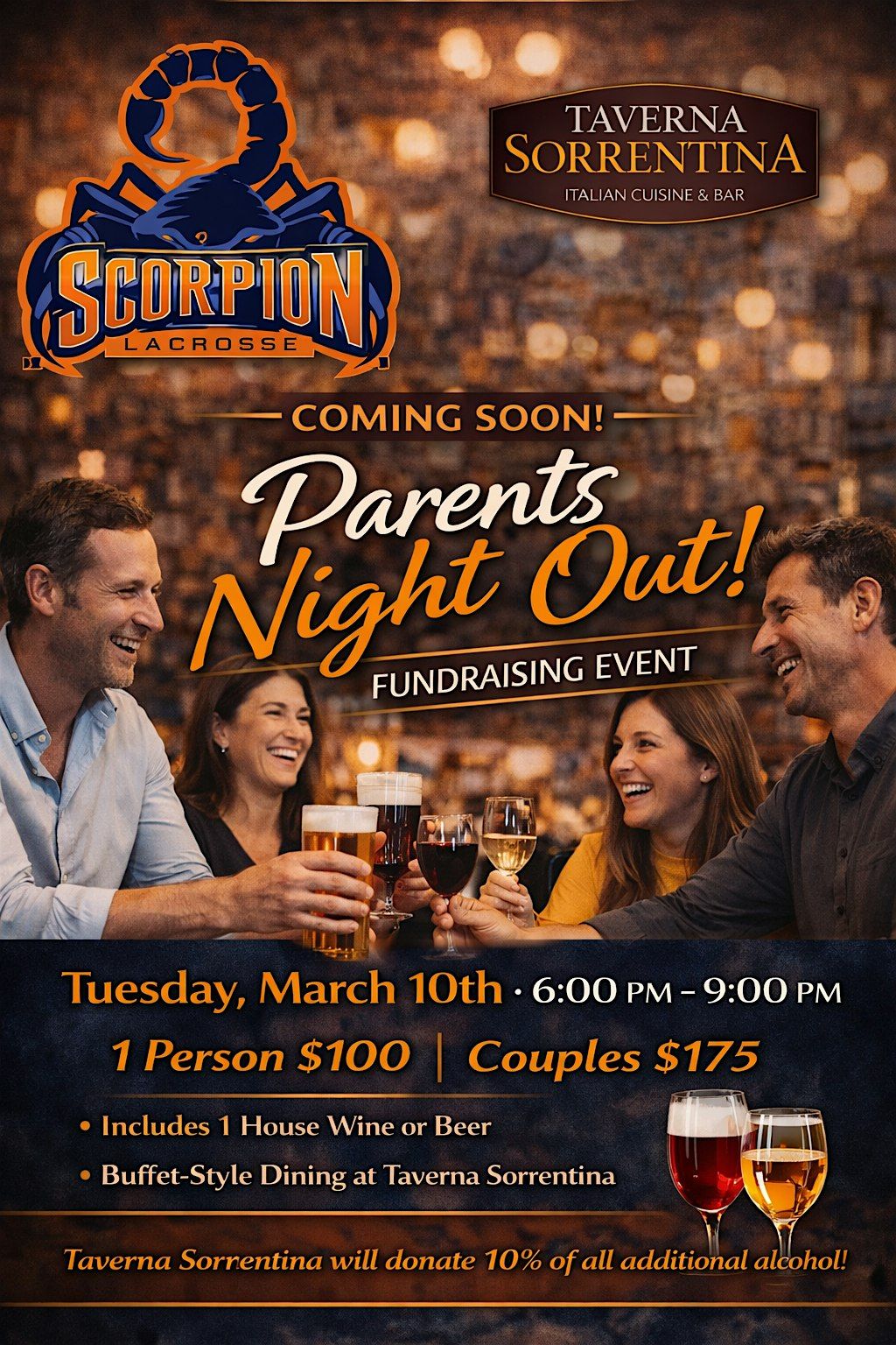 Swap carpools for cocktails and sidelines for sips 🍷 Enjoy delicious food, great drinks, and a well-deserved night out with fellow Scorpions parents - all while supporting our amazing players!