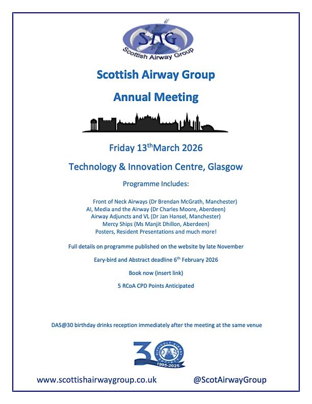 The Scottish Airway Group is delighted to annnounce it's 2026 Annual Meeting will be held in the Strathclyde University Technology & Innovation Centre Glasgow on Friday 13th March 2026.